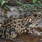 The crawfish frog typically has some specific circular patterns on its body, working as identifying marks. The species prefers living in crayfish burrows that help them avoid predation and the wintry weather along with grassland fire.